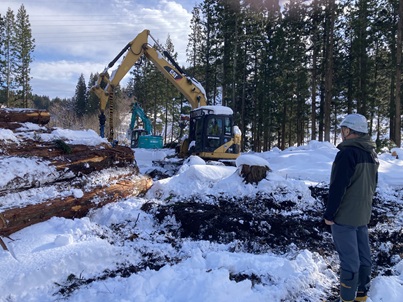 林業機械による作業の様子を離れた場所から視察している様子
